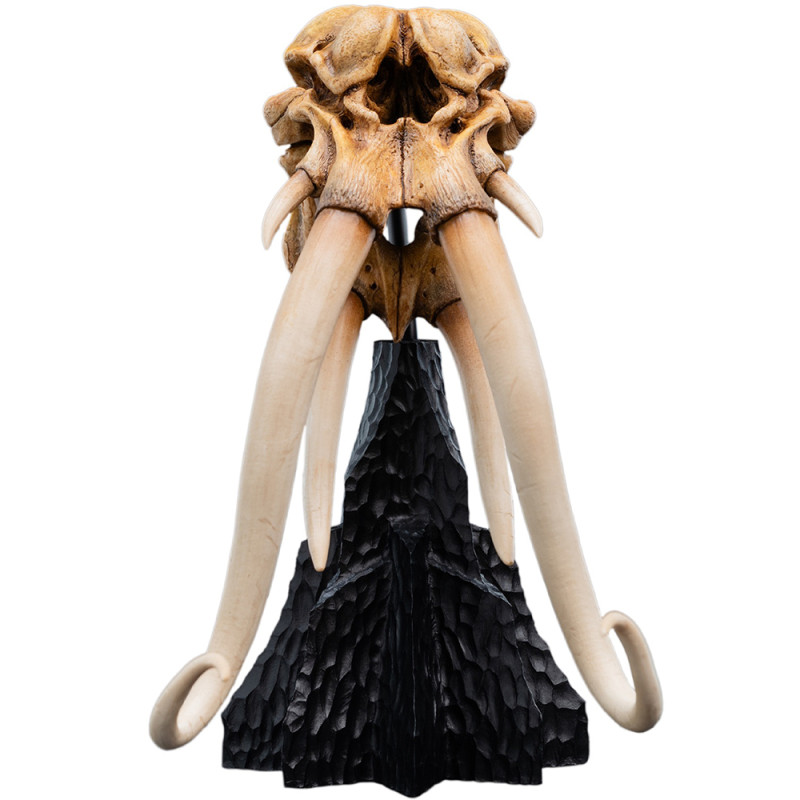 Táto zberateľská replika predstavuje detailne spracovanú miniaturizovanú lebku mûmaka. Aj keď je zmenšená do kompaktného zberateľského formátu, zachováva všetky charakteristické anatomické znaky týchto legendárnych tvorov. Masívne zakrivené kly vyrastajú z výraznej čeľuste a mohutná lebka naznačuje obrovskú silu svalov, ktoré kedysi niesli toto gigantické zviera do boja.