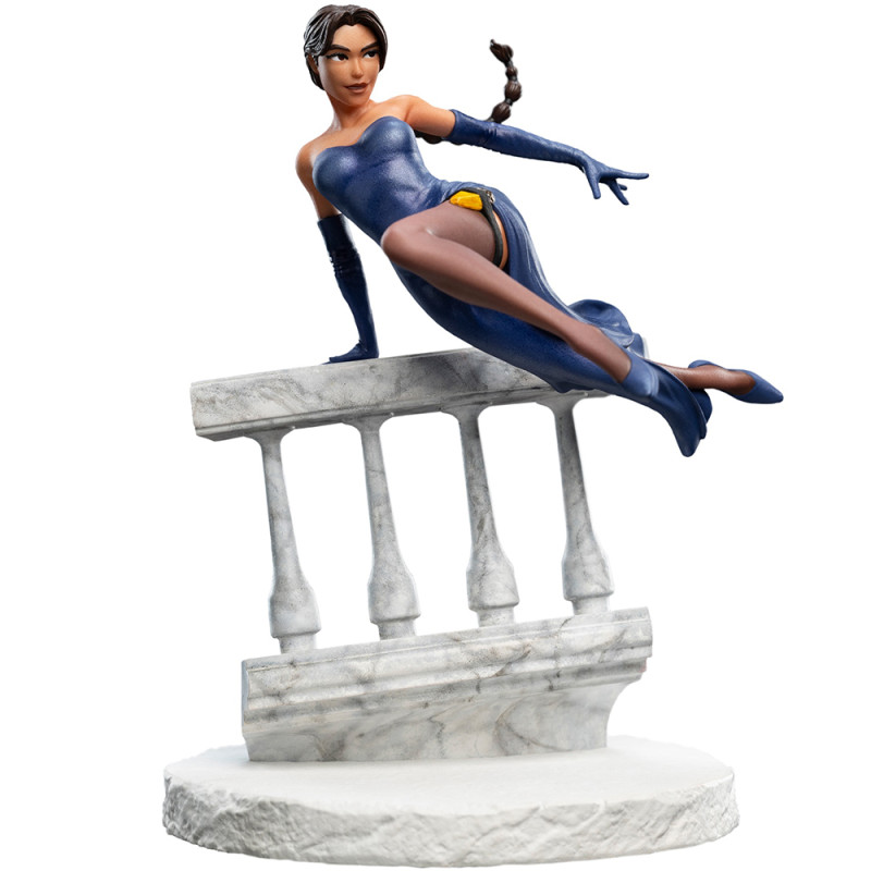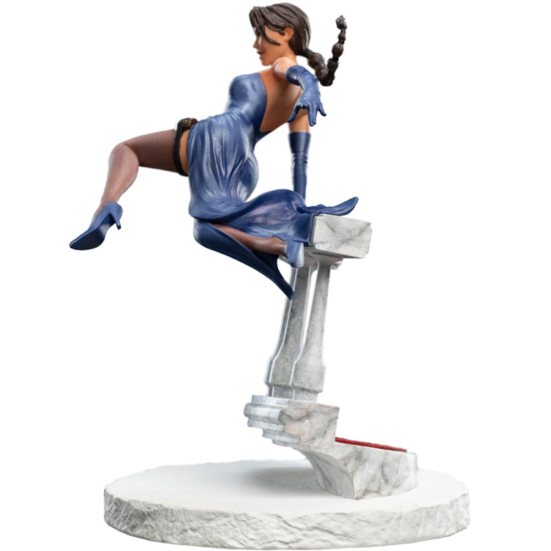 Lara je zachytená v dynamickom pohybe, ako skáče z VIP lóže, s istotou a ladnosťou, ktorá je pre ňu typická. Jej ikonické operné šaty dodávajú soche úplne iný rozmer – nie je to klasická akčná výbava, ale high-society outfit, ktorý kontrastuje s chaosom okolo nej.